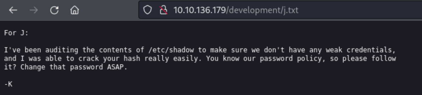 When we access the directory, we'll see two text files, **`dev.txt`** and **`j.txt`**. Let's open both.&#x20;